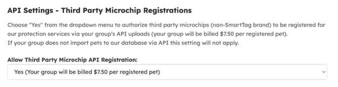 Yes! Non-SmartTag microchips can be registered for a one-time cost of $7.50. To enable this feature from your SmartTag Implant Group Dashboard, navigate to the settings tab and select “Yes” from the dropdown: