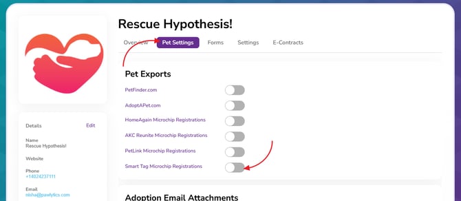 First you'll need to complete this form and wait for SmartTag to email your API Key. Then navigate to the Pet Settings tab in your Organization Settings where you will find the toggle switch to turn on PetLink